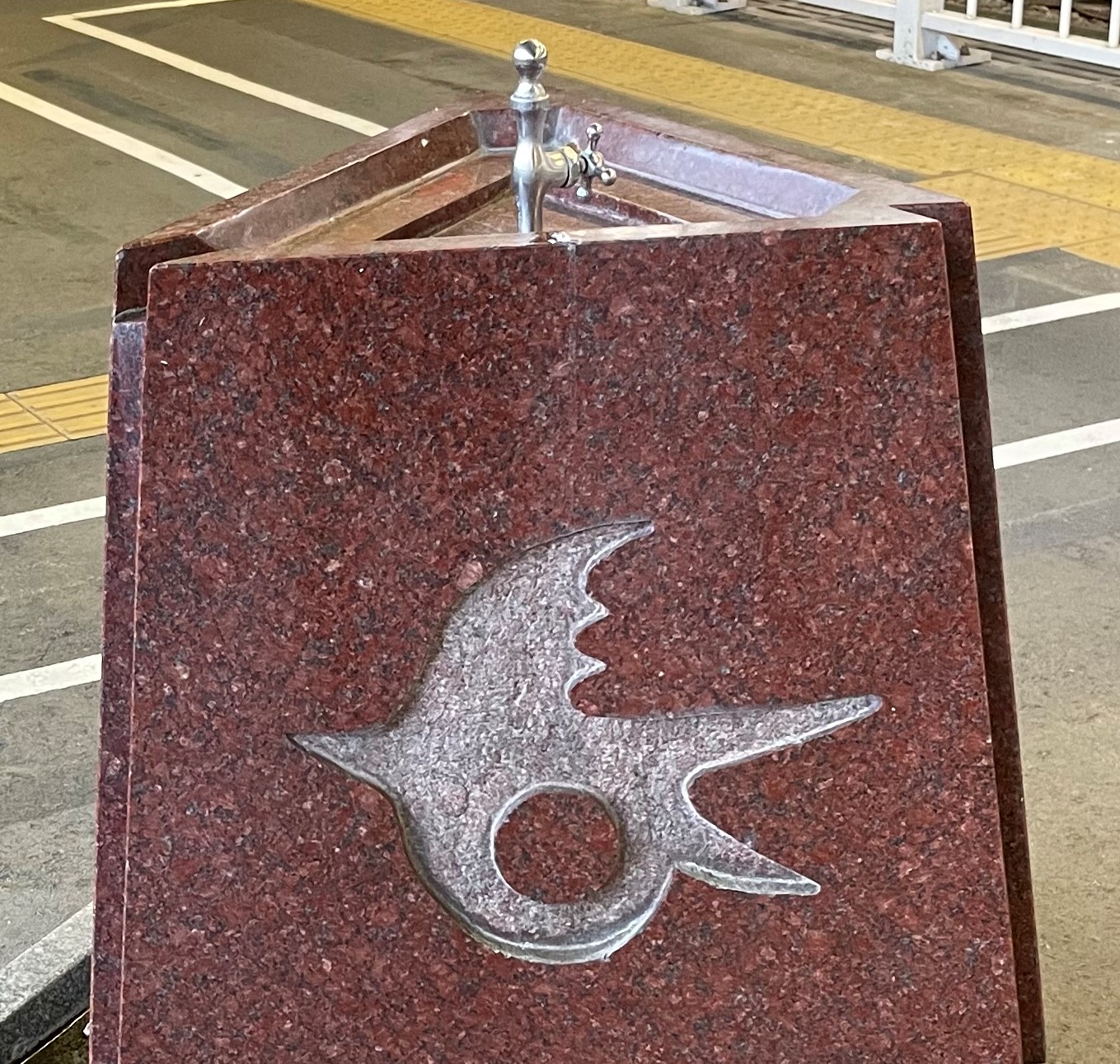 「飲料水」と書かれた看板の下にレトロな趣の水飲み場